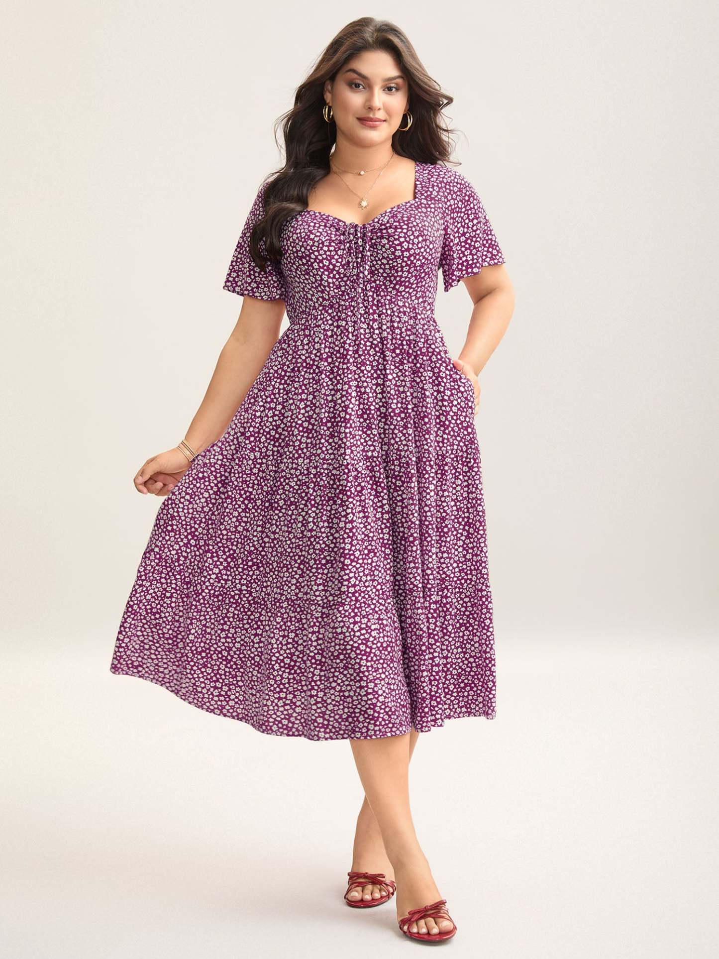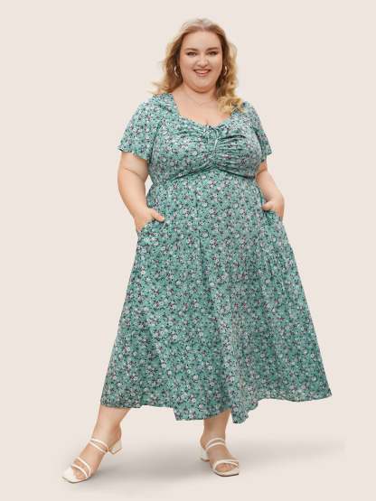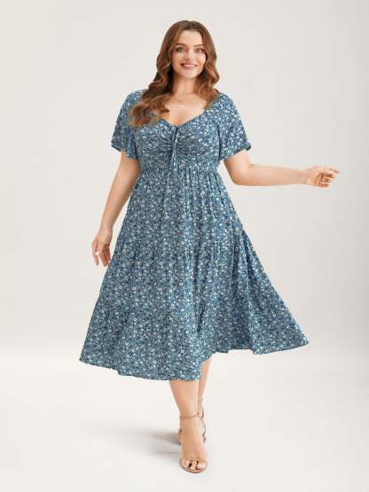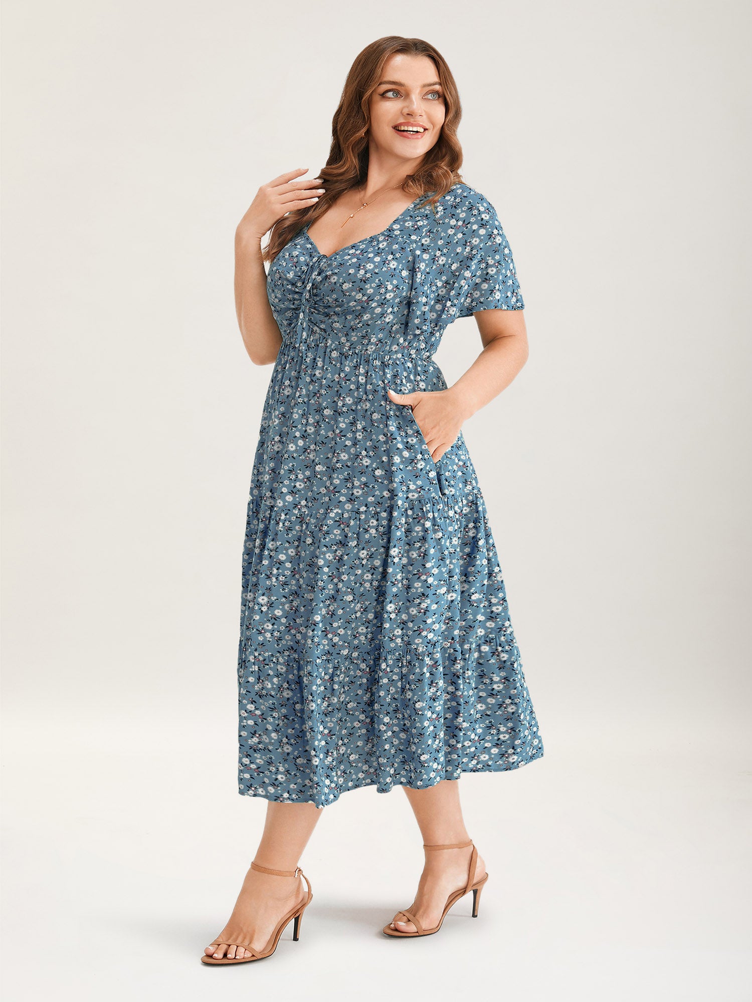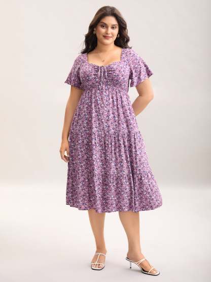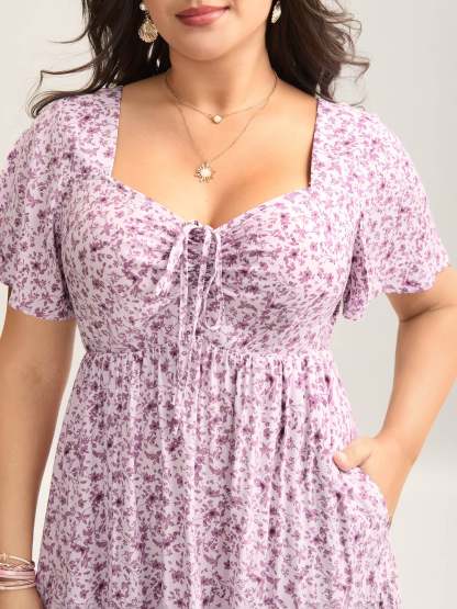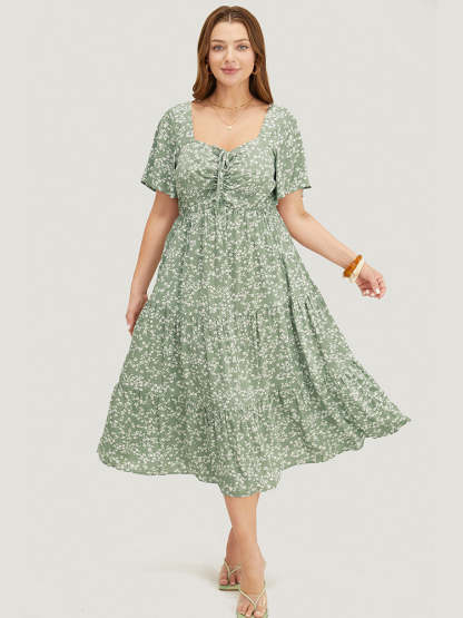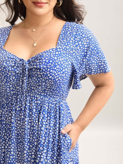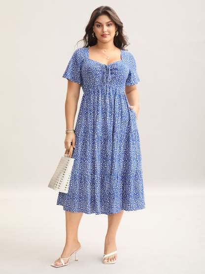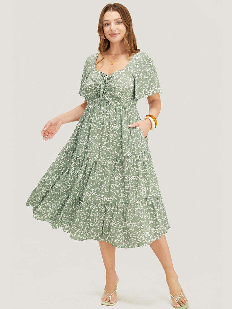 Ditsy Floral Sweetheart Drawstring Pocket Tiered Dress