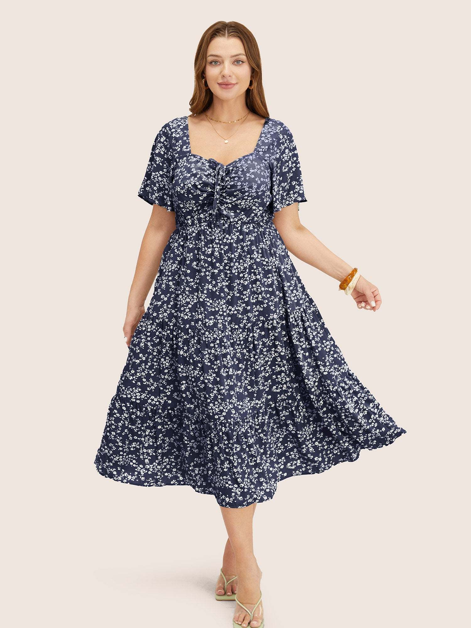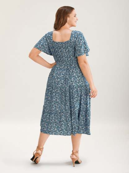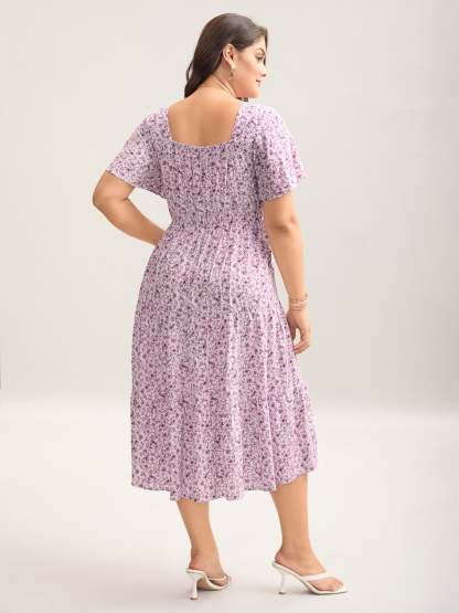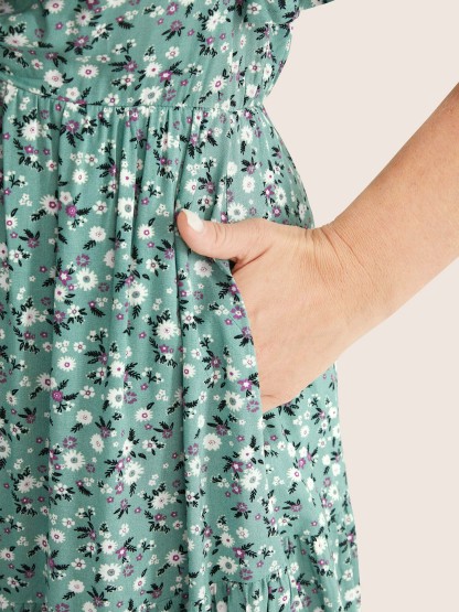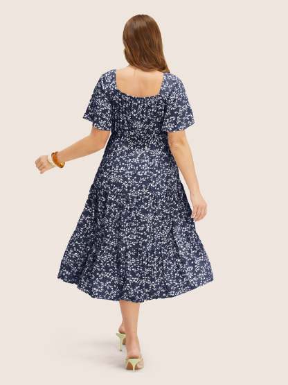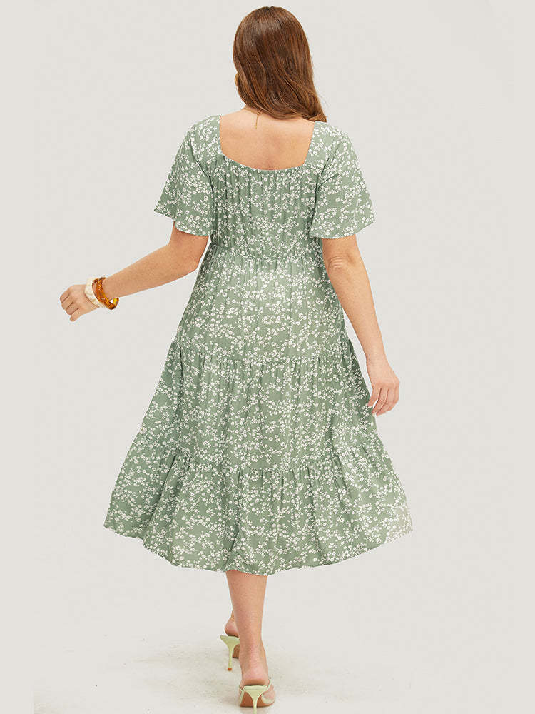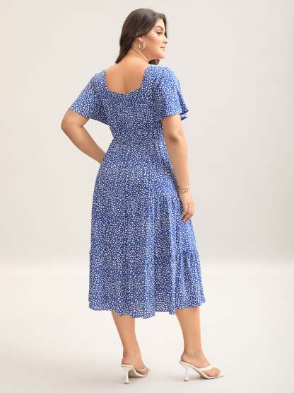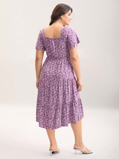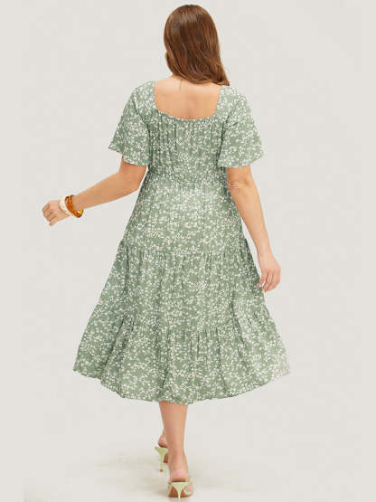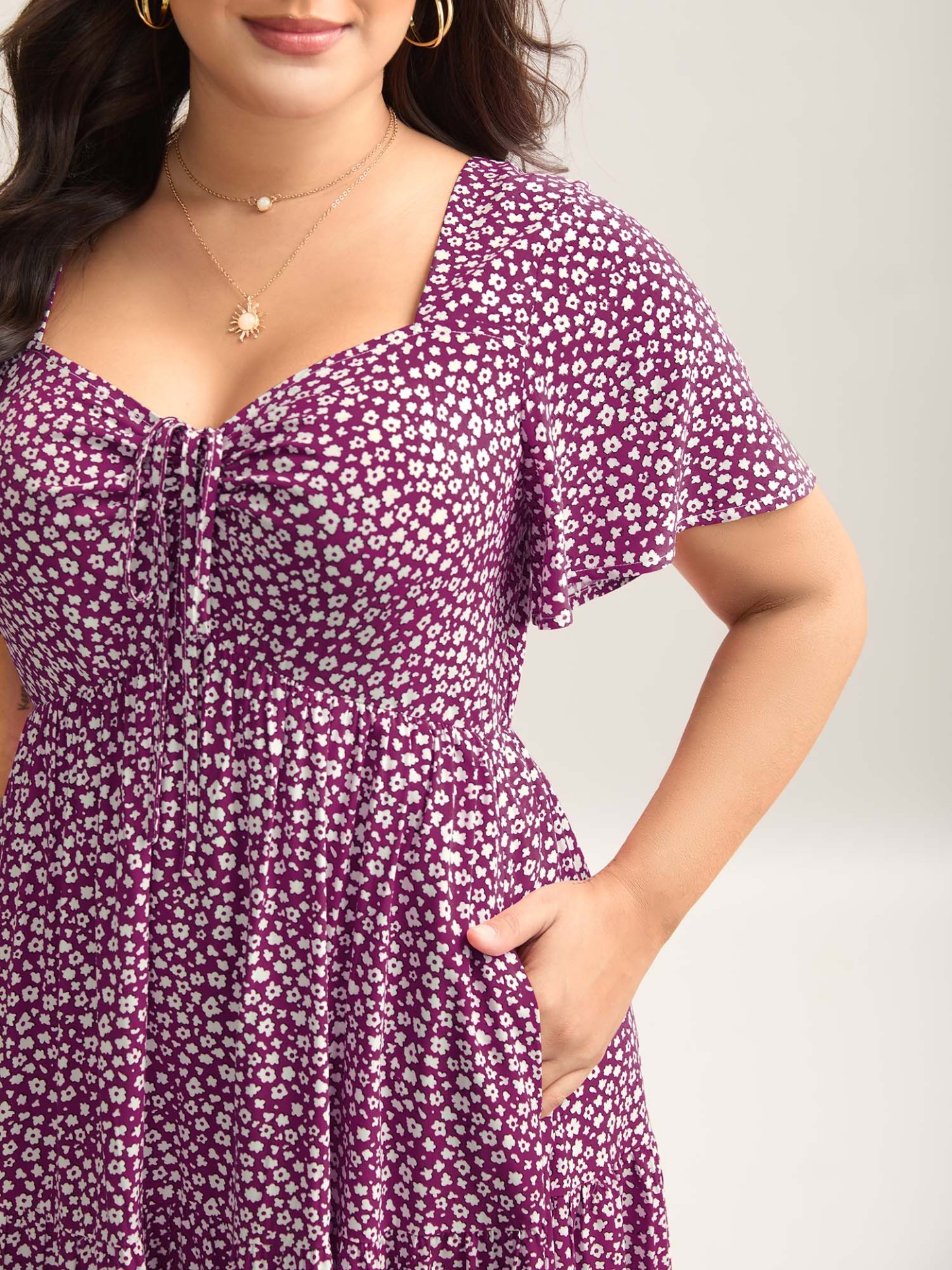 Ditsy Floral Sweetheart Drawstring Pocket Tiered Dress