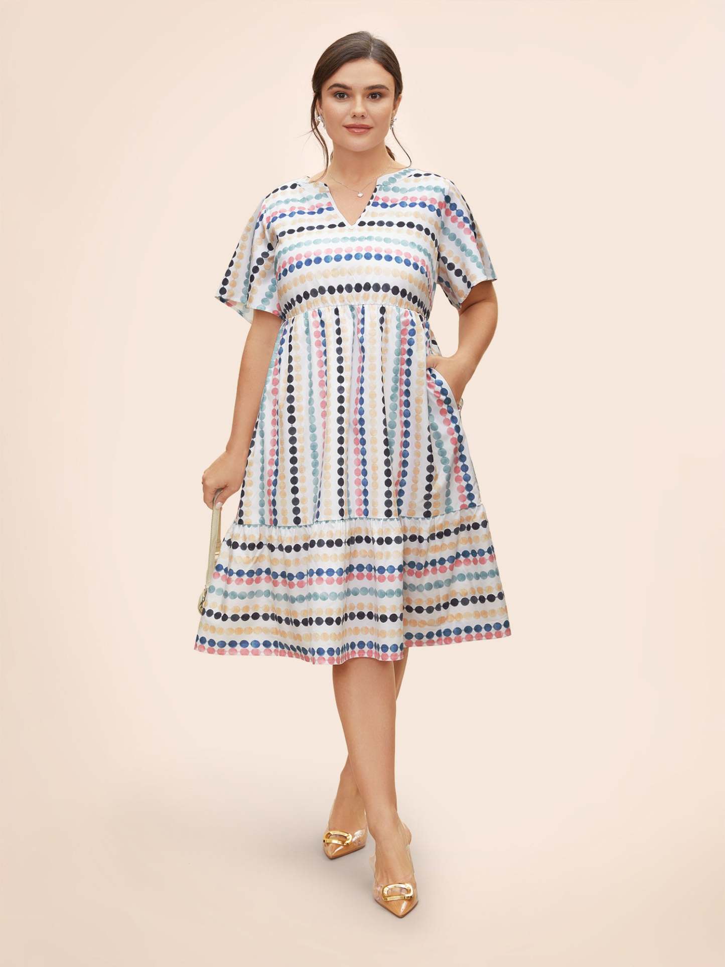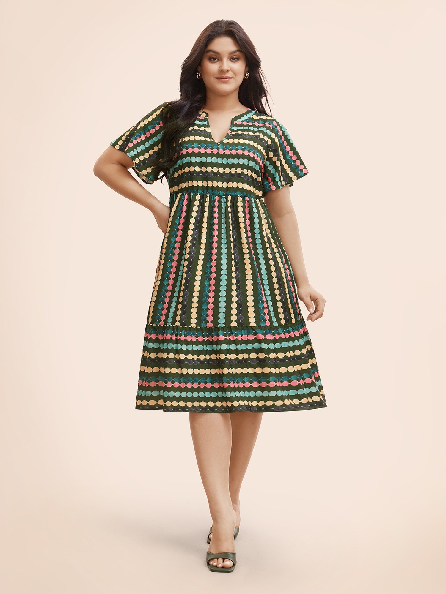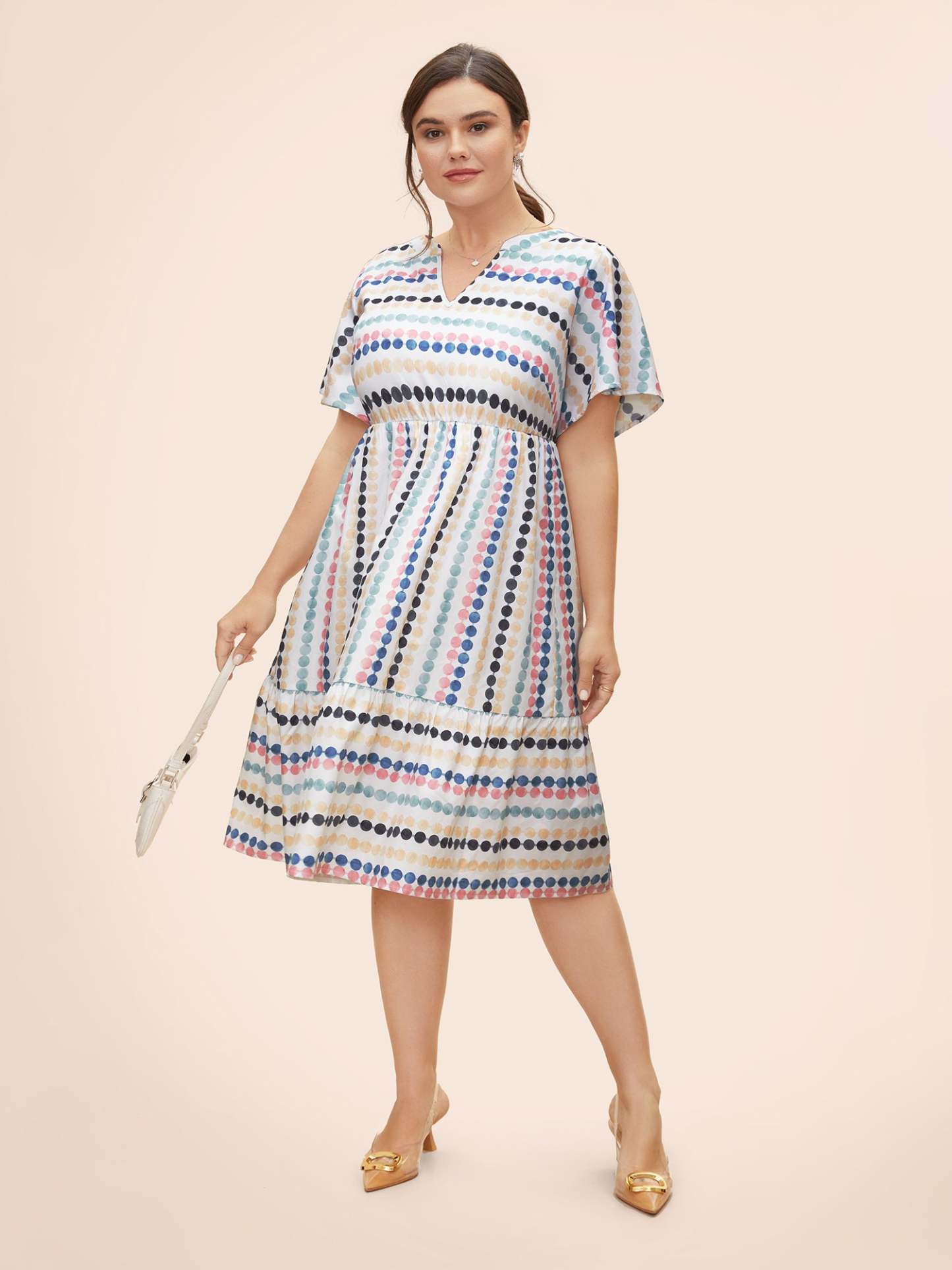 Dot Print Elastic Waist Split Neck Midi Dress