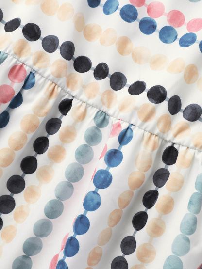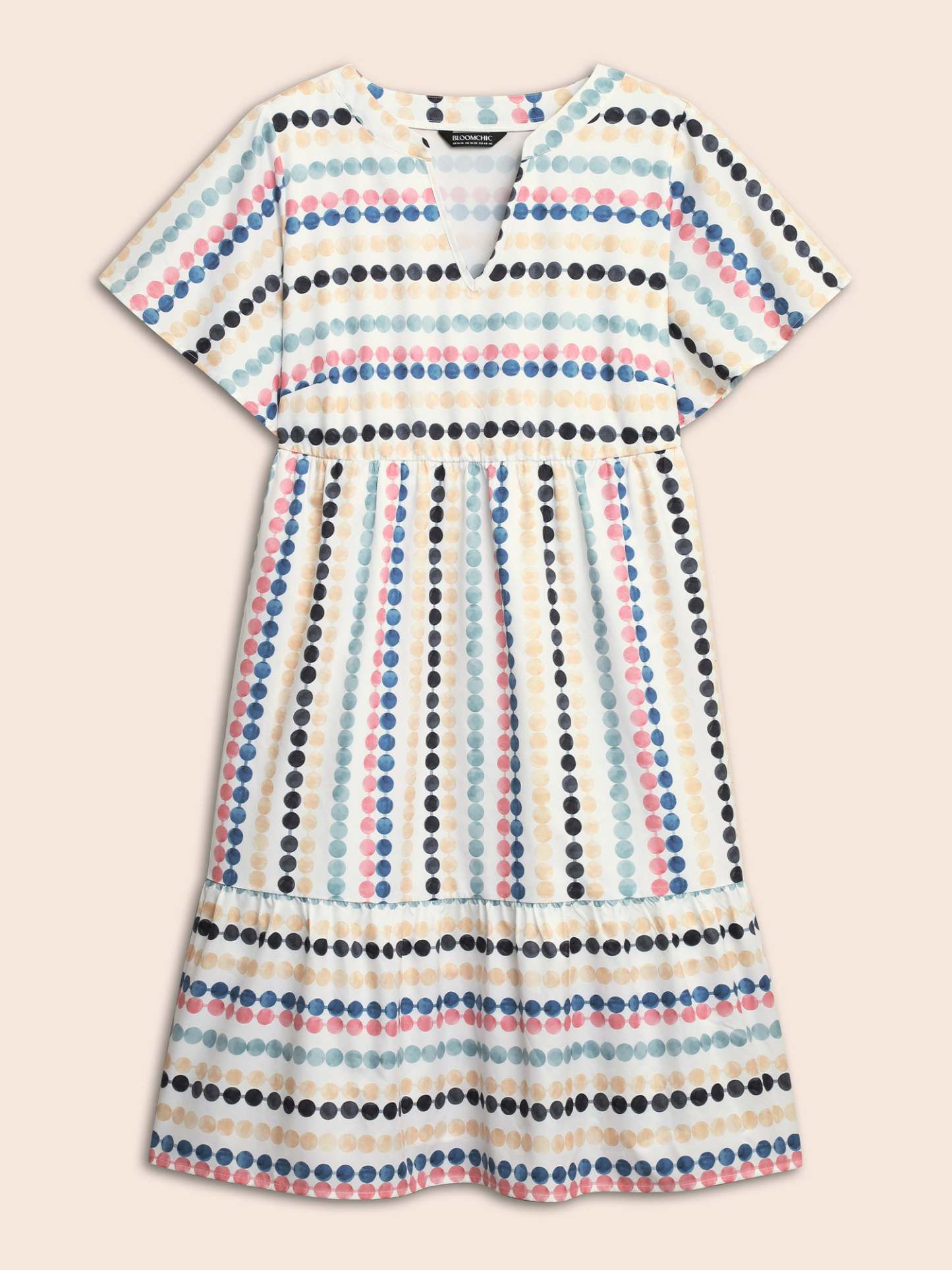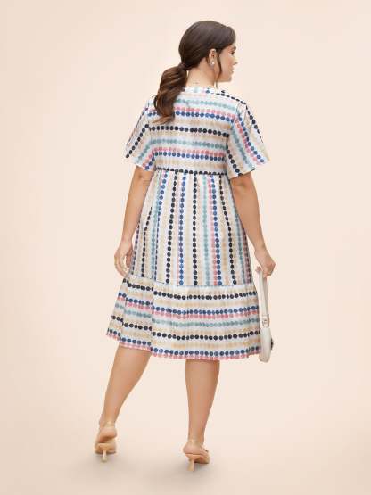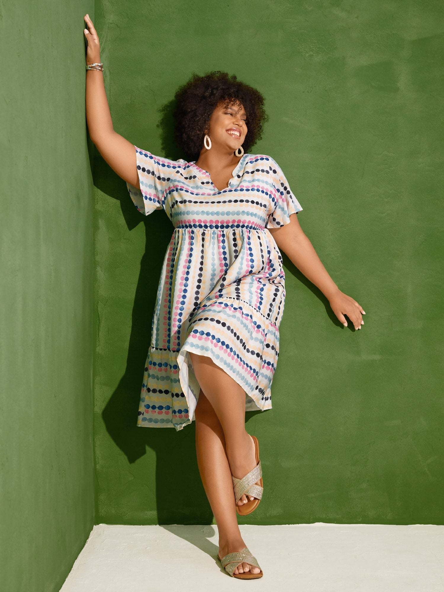 Dot Print Elastic Waist Split Neck Midi Dress