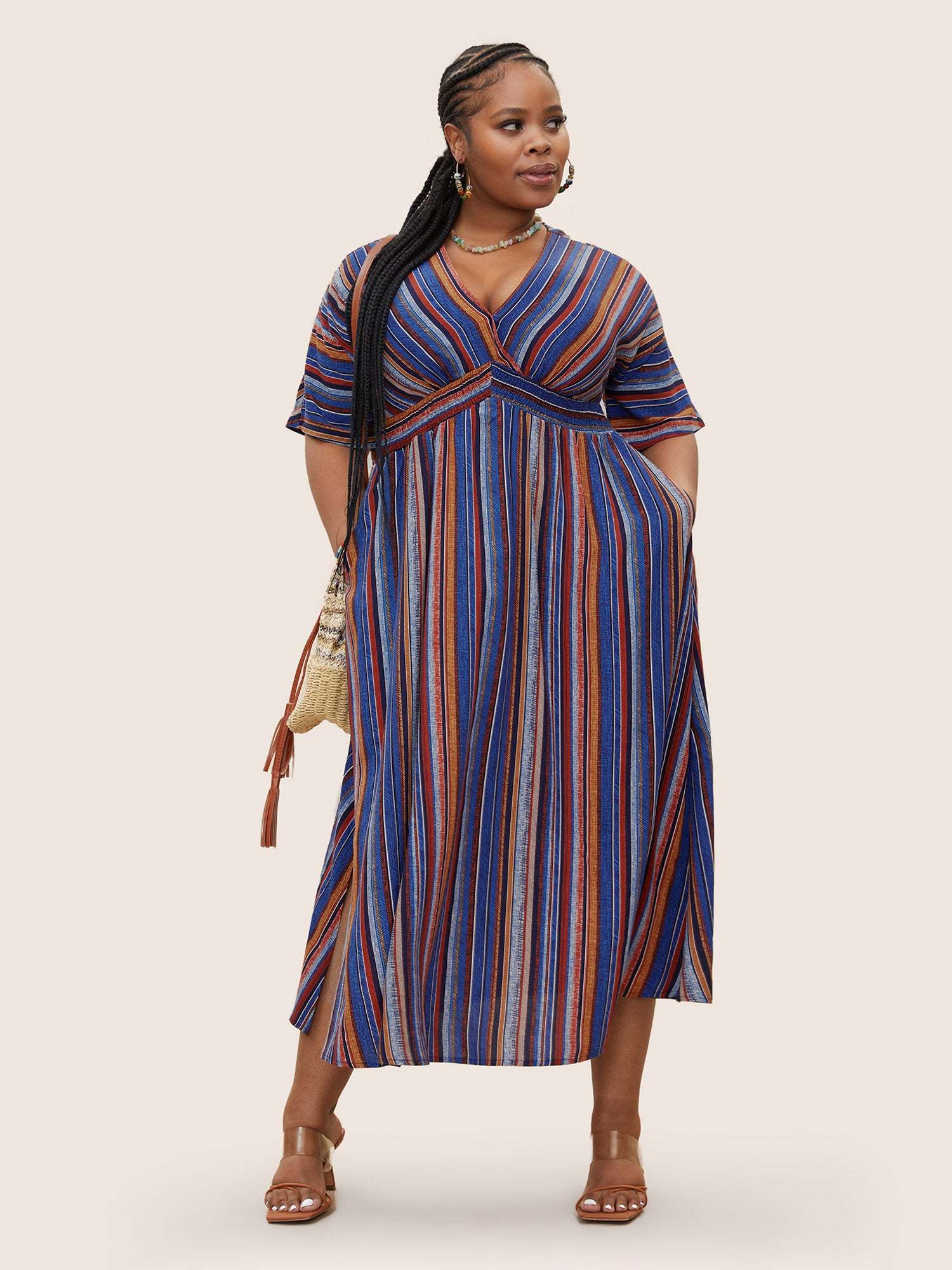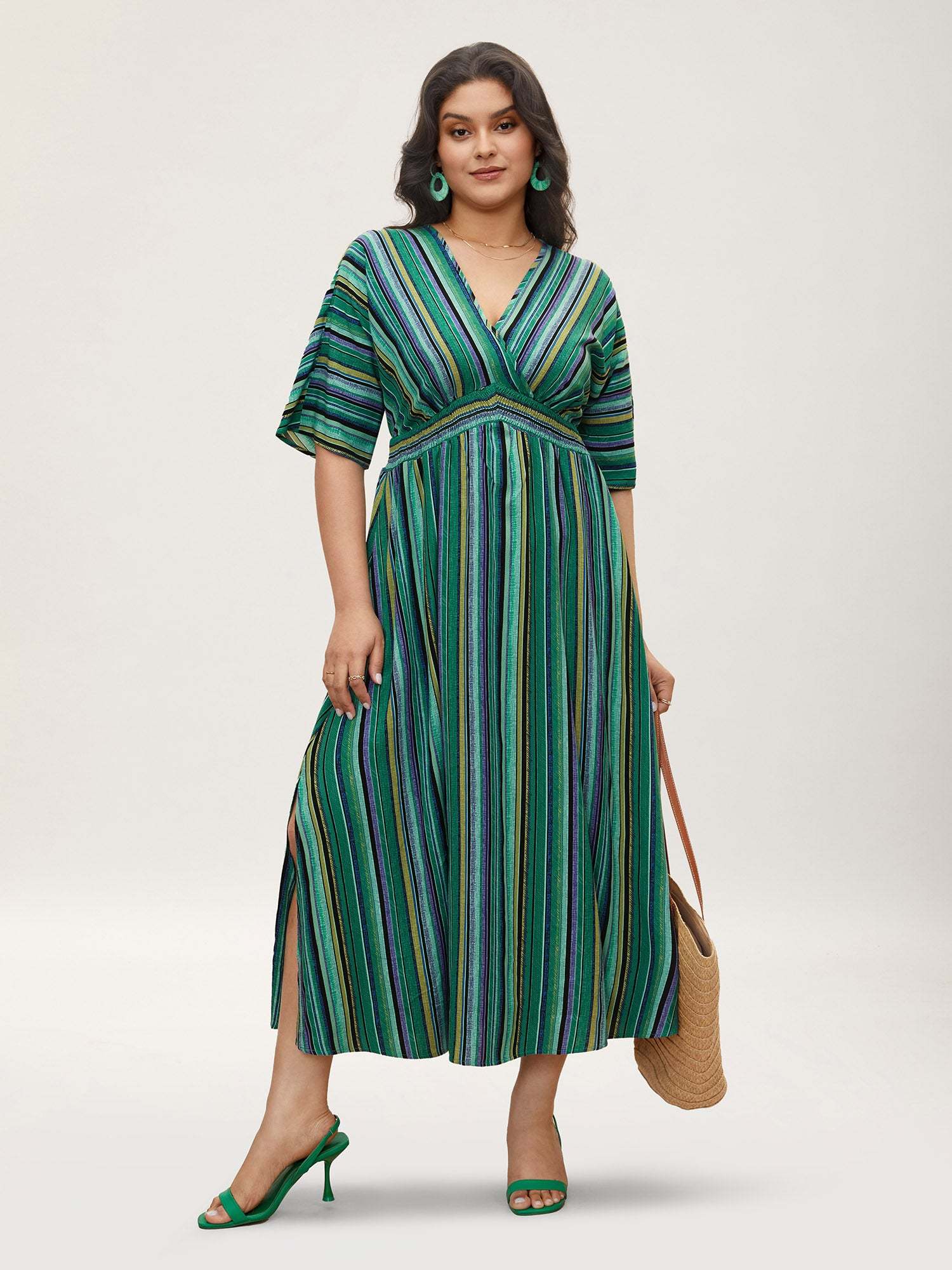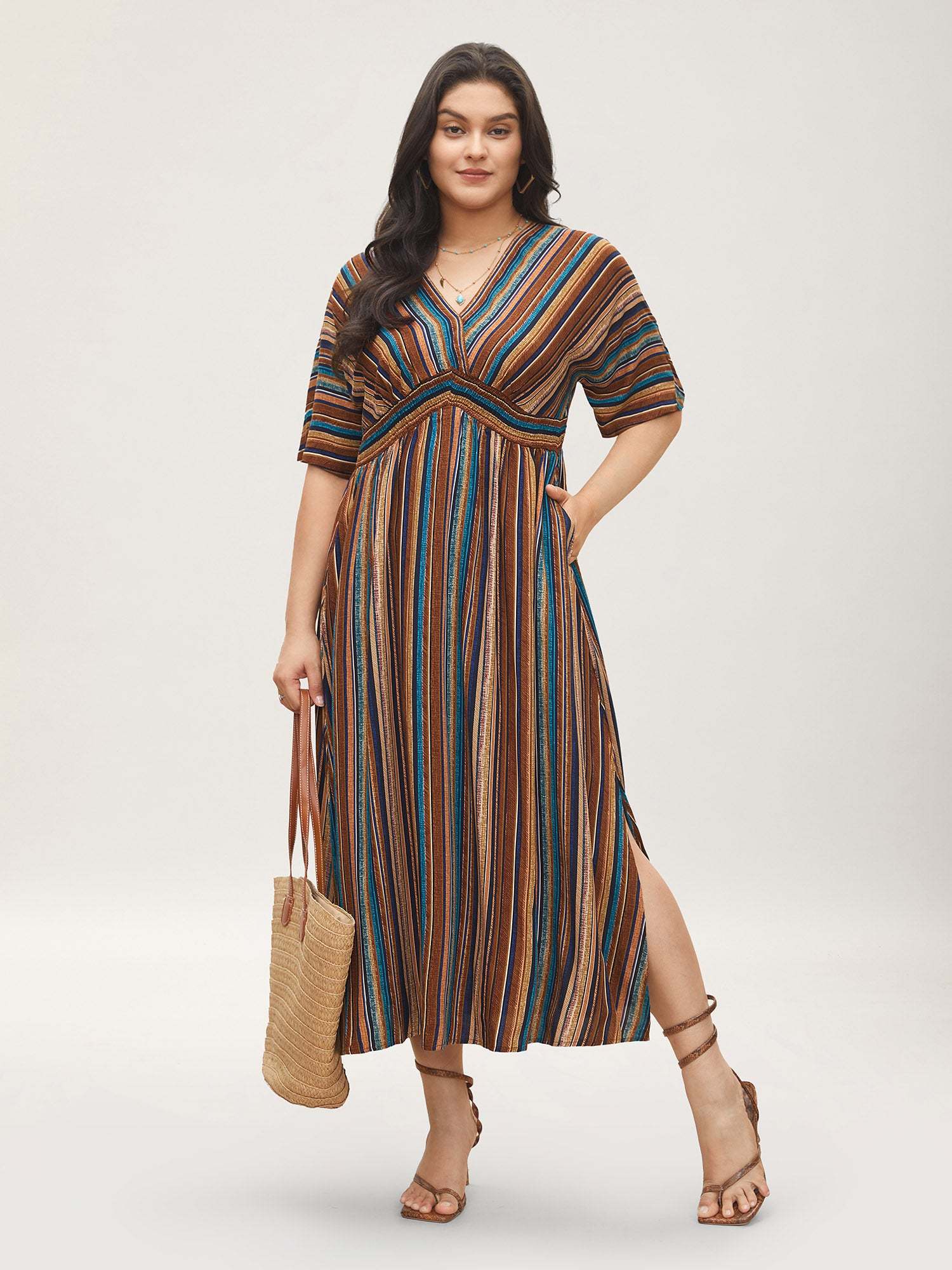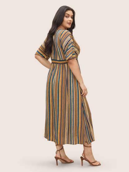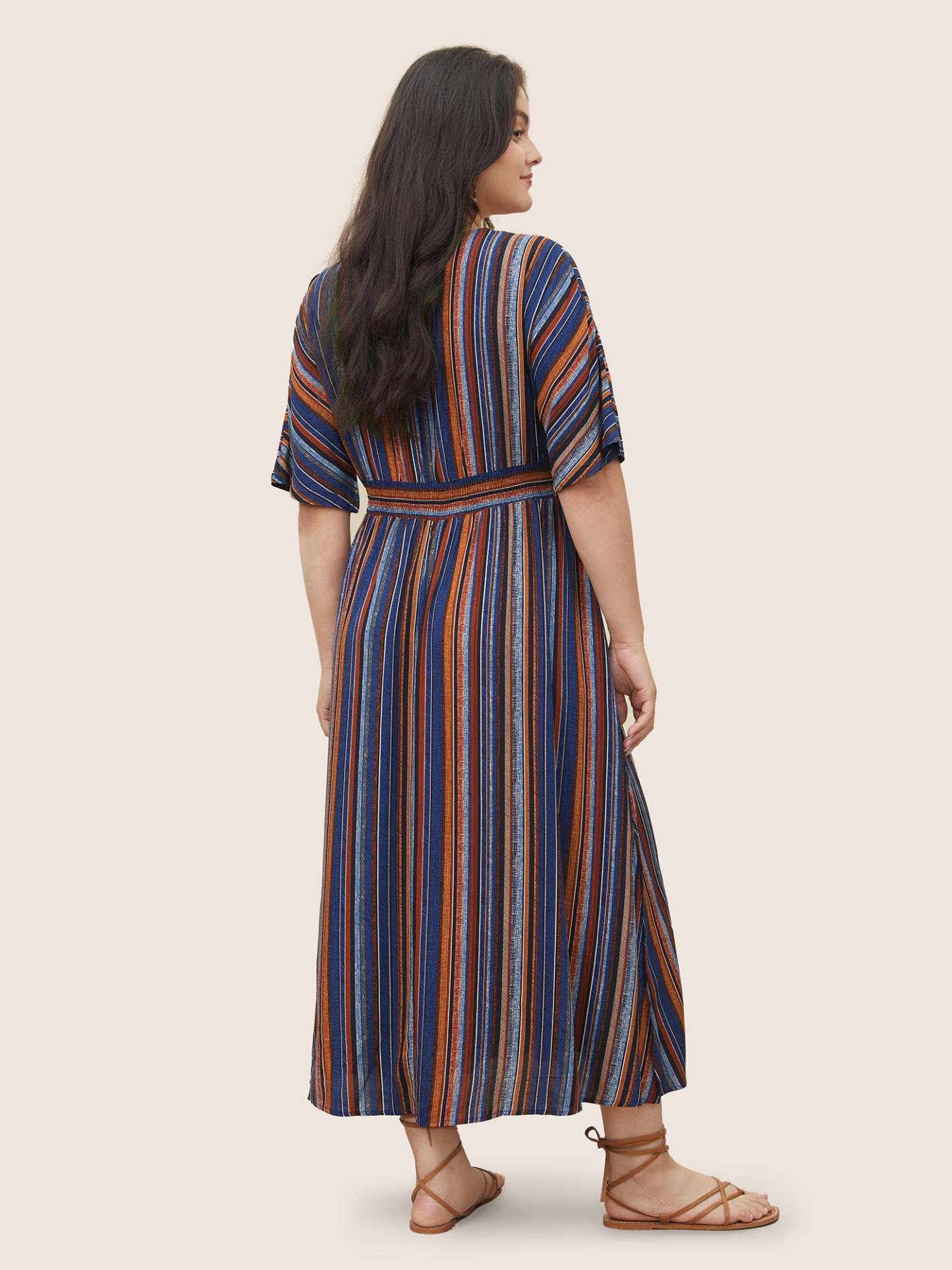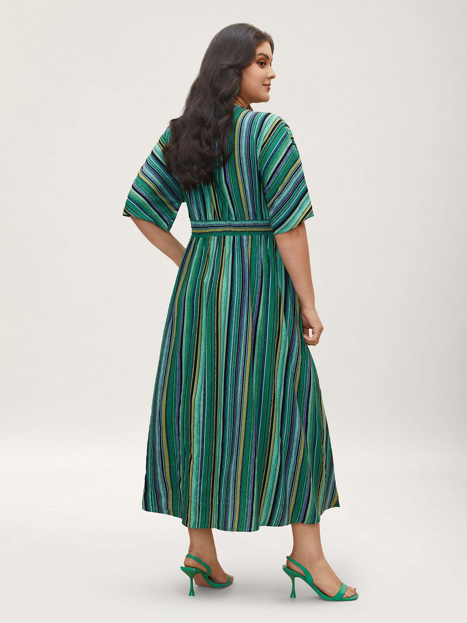 Striped Contrast Dolman Sleeve Shirred Pocket Split Flutter Dress