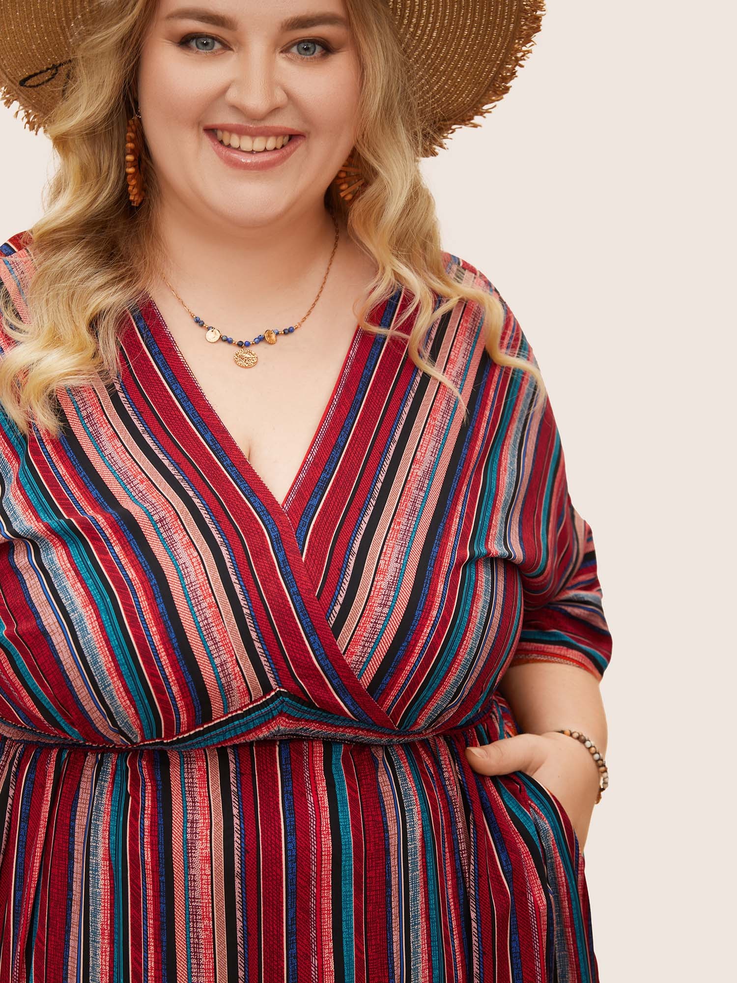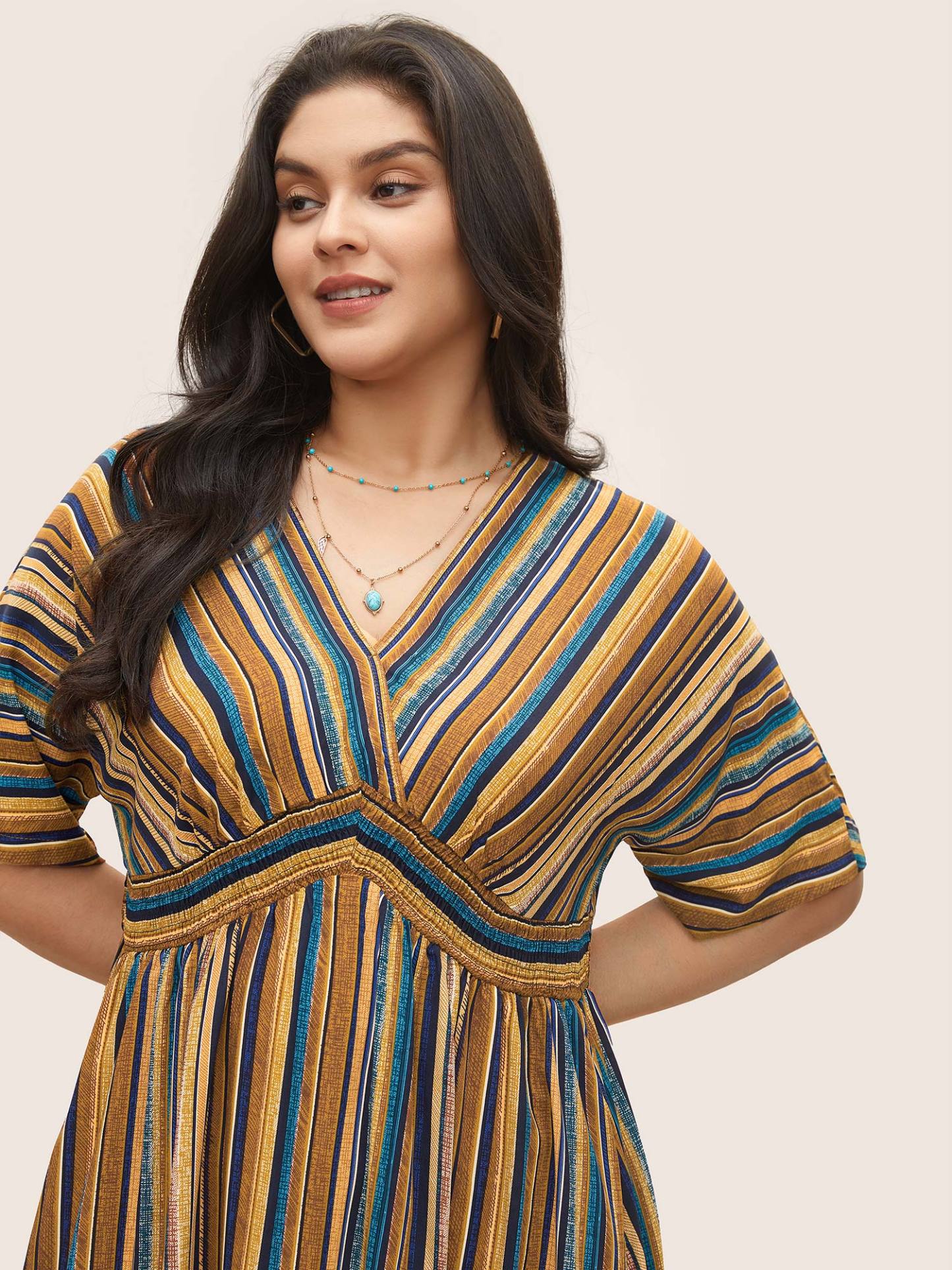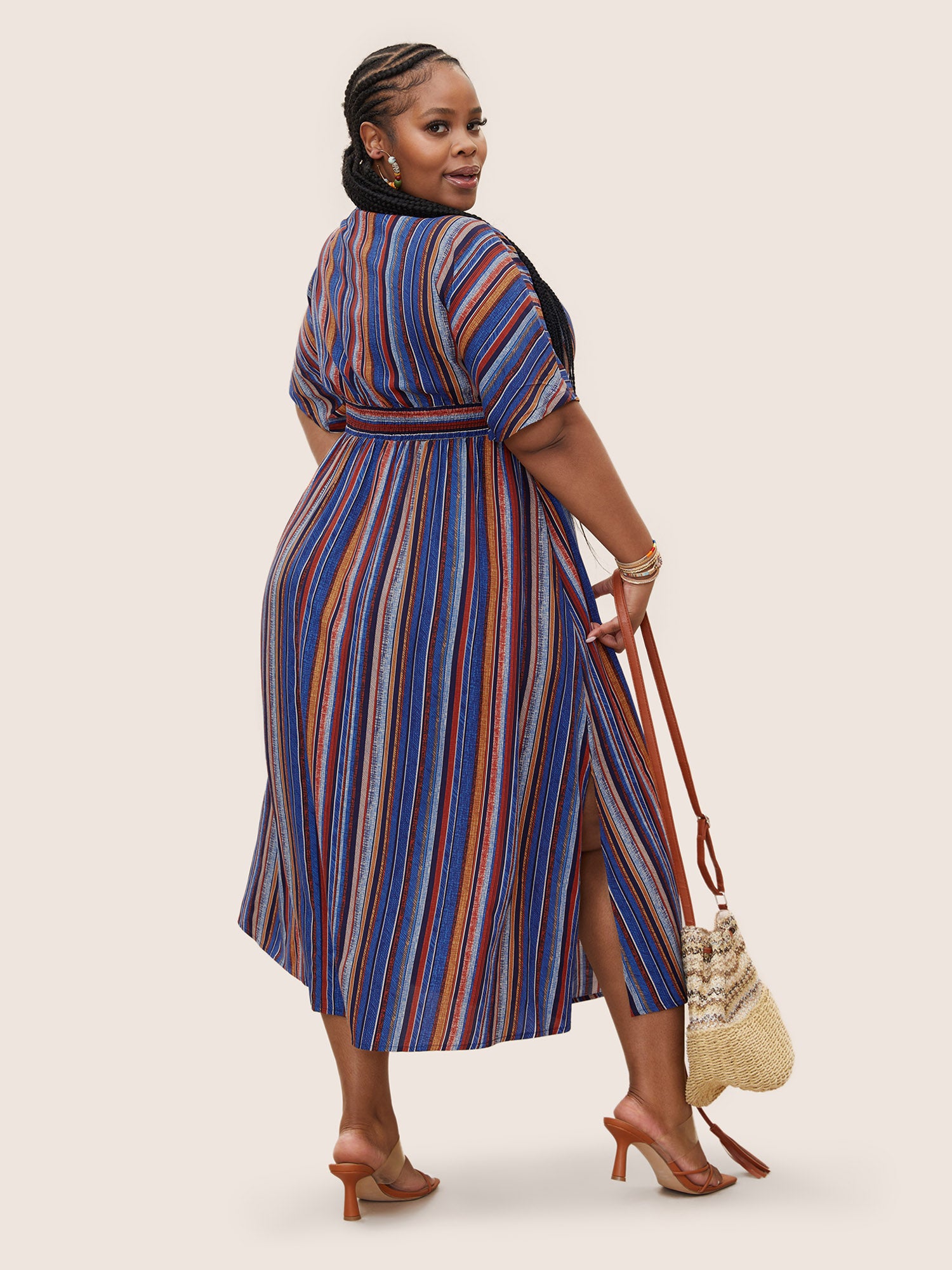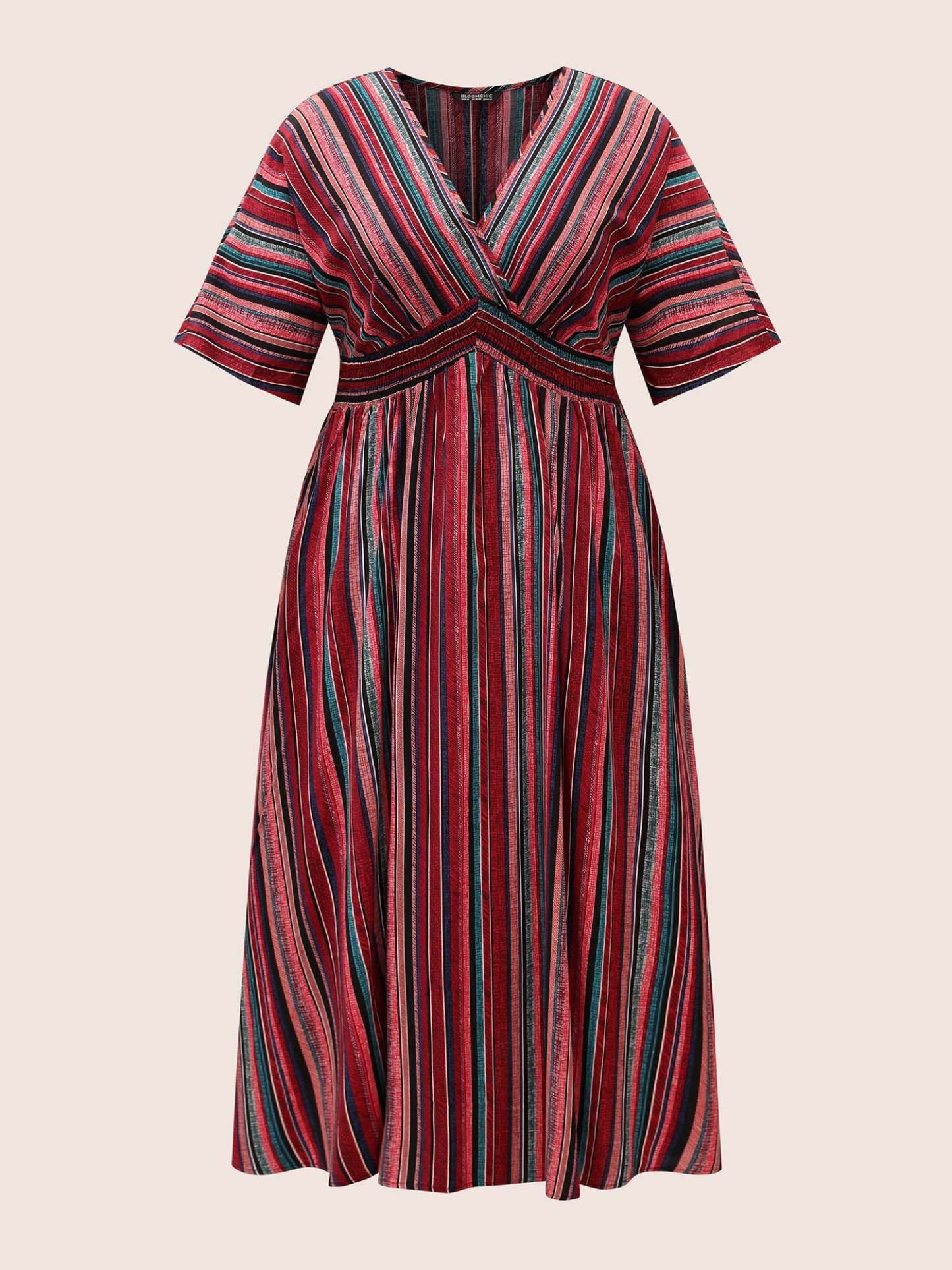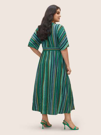 Striped Contrast Dolman Sleeve Shirred Pocket Split Flutter Dress