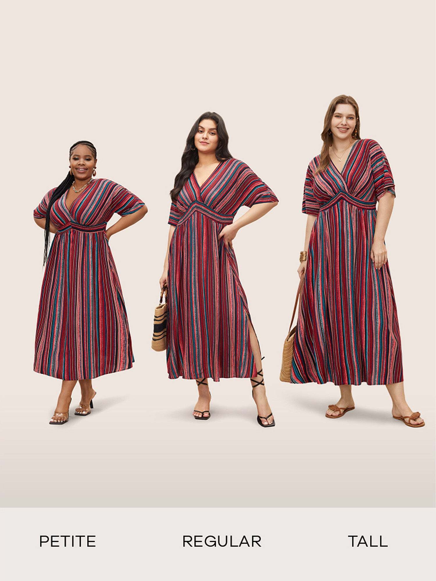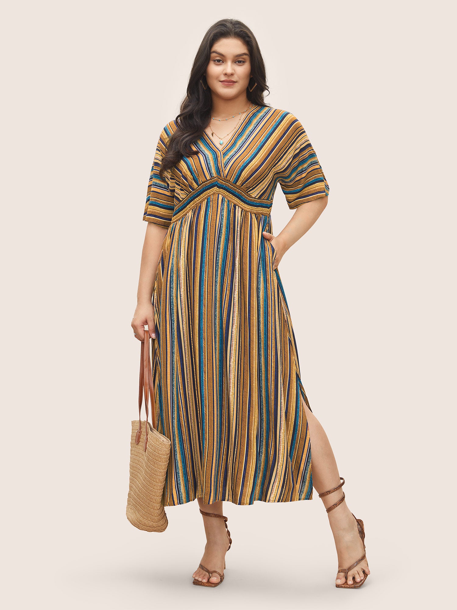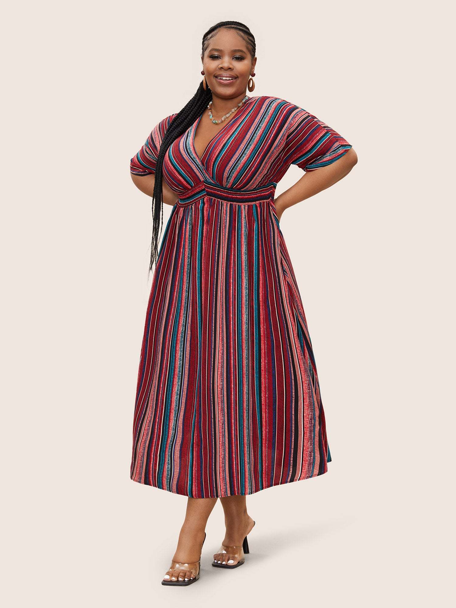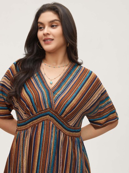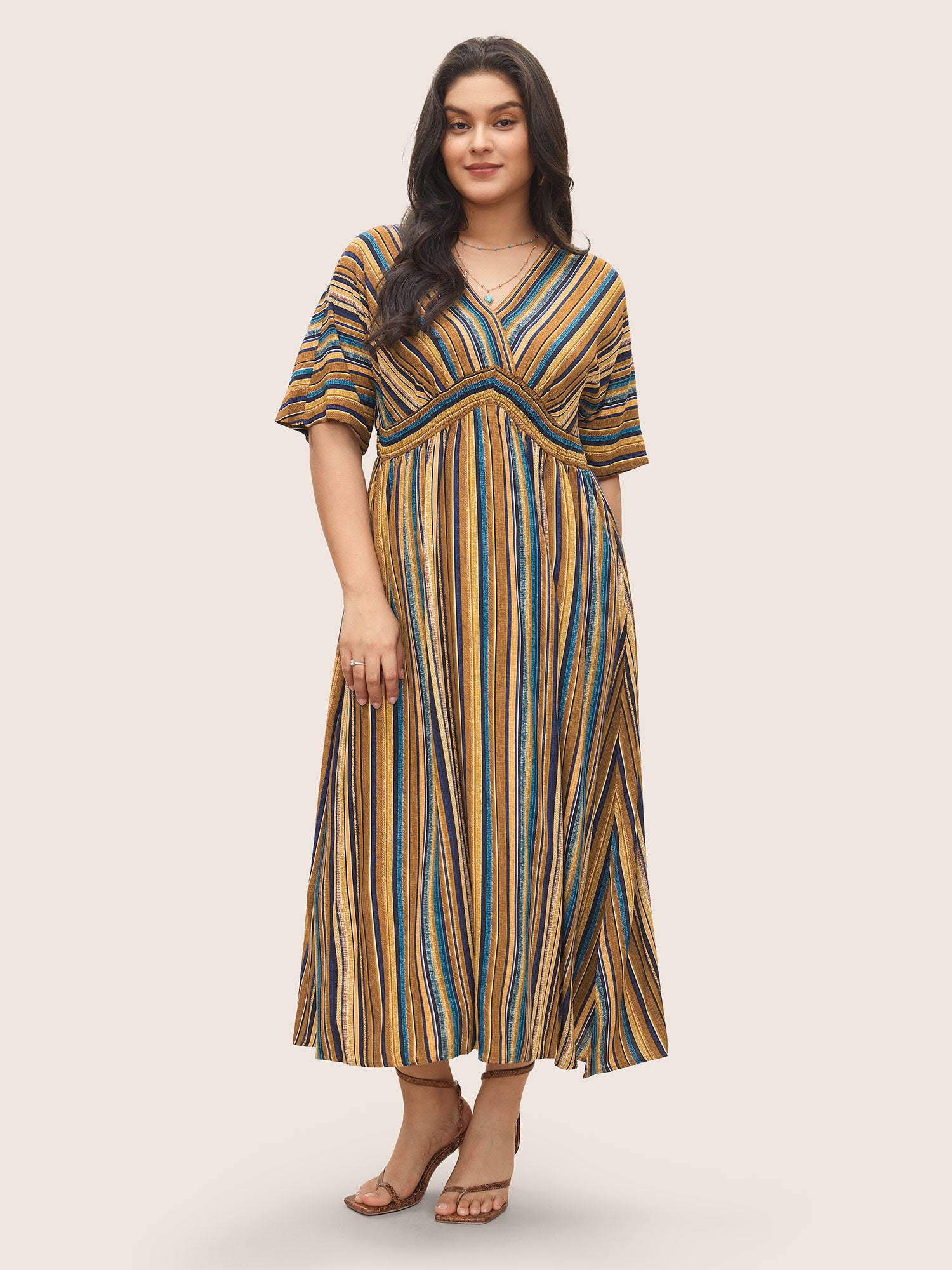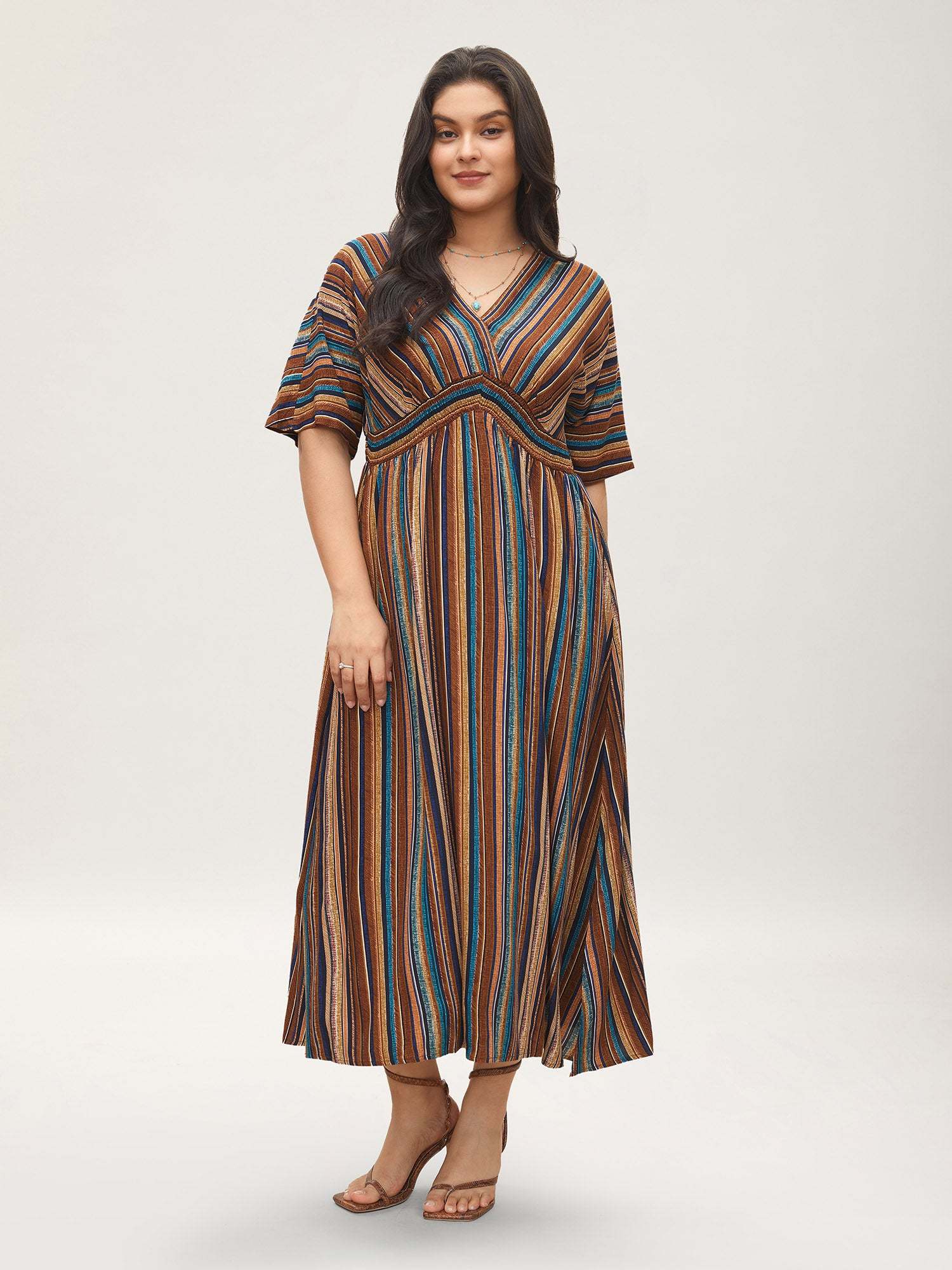 Striped Contrast Dolman Sleeve Shirred Pocket Split Flutter Dress